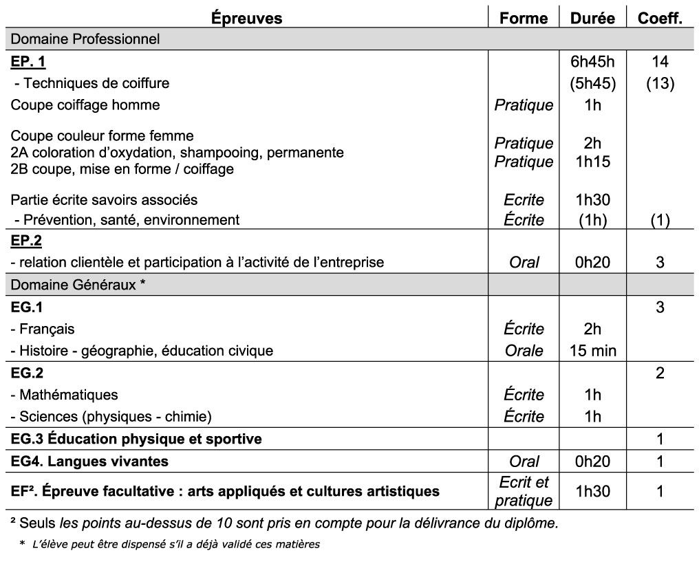 Réalisation d’un diagnostic ; Techniques utilisant les produits d’hygiène ou capillaires; techniques de modification de la couleur des cheveux; techniques de modification durable de la forme des cheveux; techniques de modification temporaire de la chevelure; techniques de séchage; techniques de coupe; techniques de coiffage.